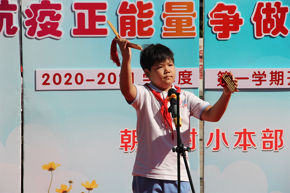 六年级同学朗诵《新时代中国梦》,畅想祖国的未来。五年级同学结合常态化疫情防控,以故事、快板的形式引导学生们进行垃圾分类,保护环境,爱护校园。新一年级师生互动,全校师生展示“朝师附小抗疫数字歌",稚嫩的童声引来阵阵掌声。