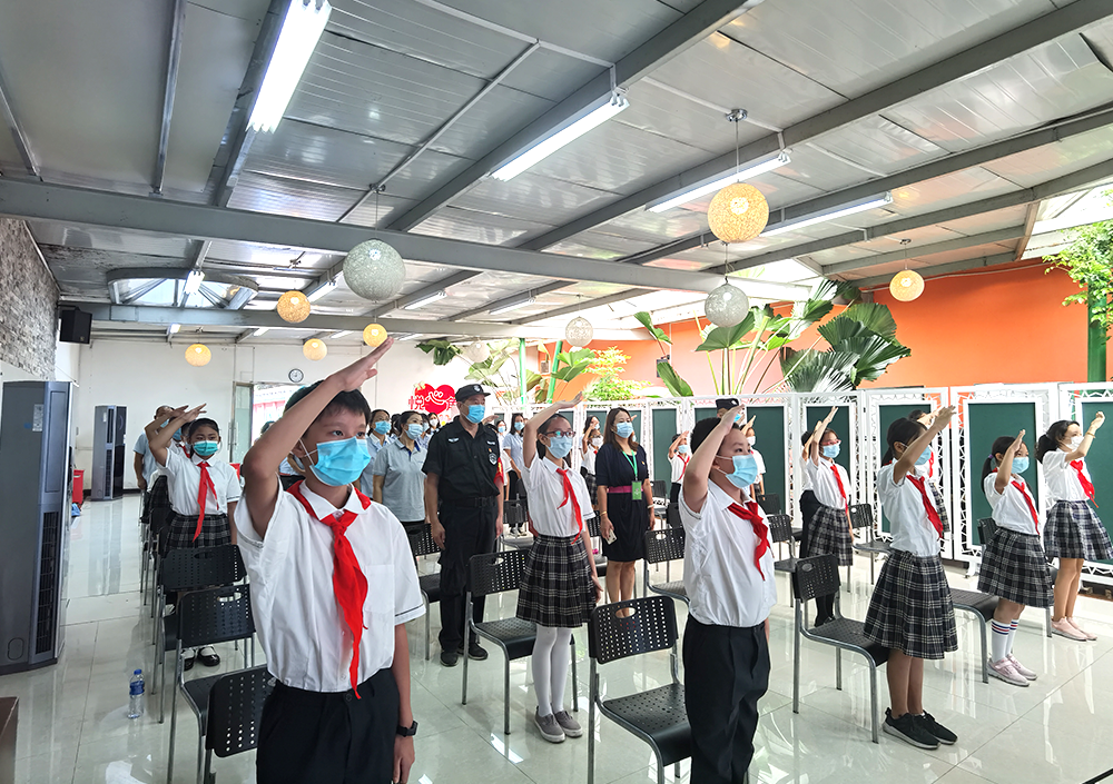 西坝河校区为迎接学生返校,特意搭建了美丽梦幻的气球门,希望同学们在新的学期中,怀揣五彩斑斓的美丽梦想,扬帆起航,飞向更高更远的天空。一名有40年党龄的保安师傅与师生们共同参加了开学典礼。开学典礼上,孩子们回顾了疫情期间的学习生活,并对新学期满载理想与希望。