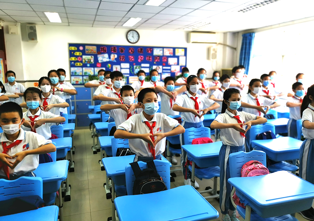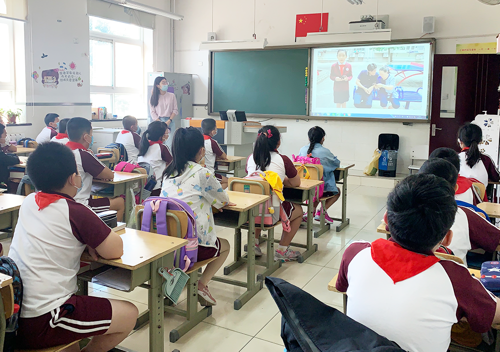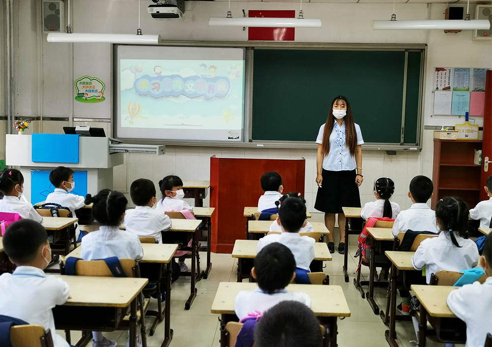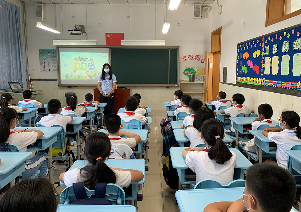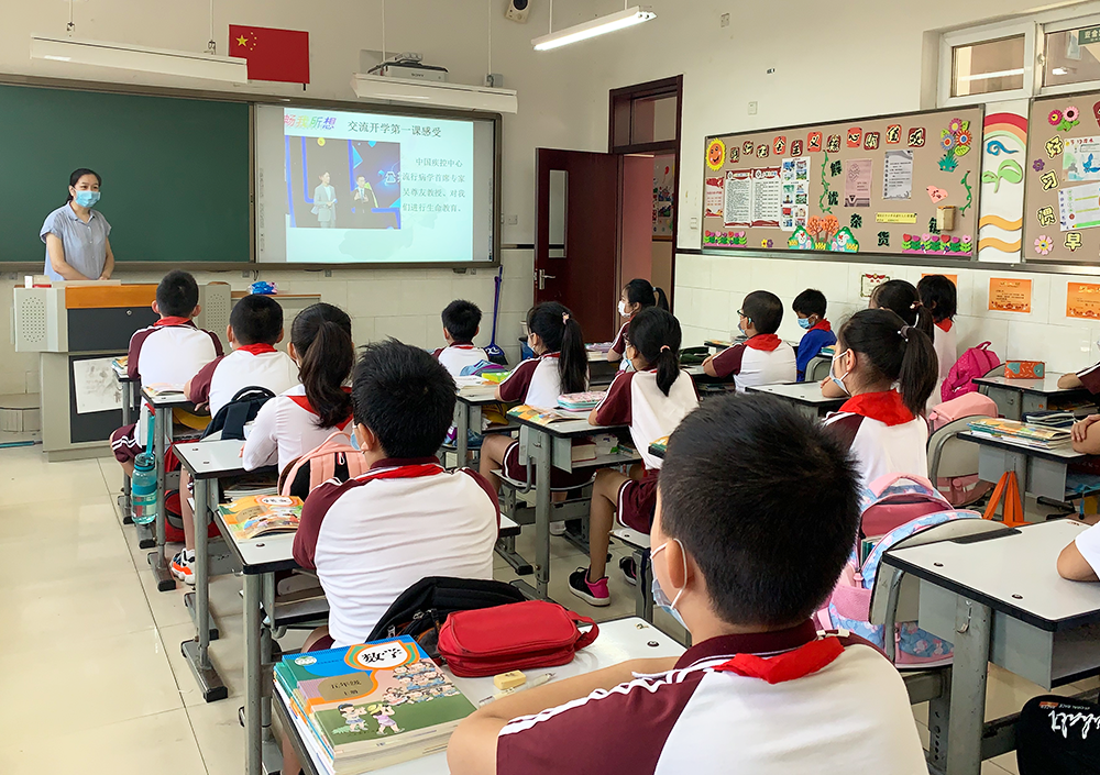 教室内外响起嘹亮的国歌声,庄严的仪式拉开了开学典礼的序幕。全体一年级同学齐诵《附小学子抗疫三字歌》,带领全体同学回顾校园防疫歌谣。校区邀请奔赴武汉一线参加抗疫工作的学生家长郑子宸妈妈到校,为师生们讲述抗疫中的故事。