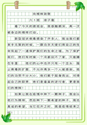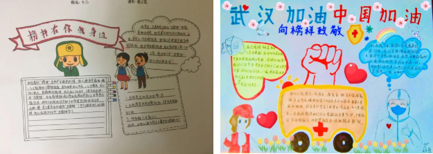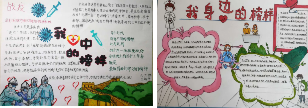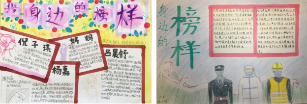还有的同学用手抄报的形式,图文并茂地展示疫情以来的榜样。他们用最真挚的语言描绘出那些默默无闻的战斗英雄,发现点点滴滴的闪光点。