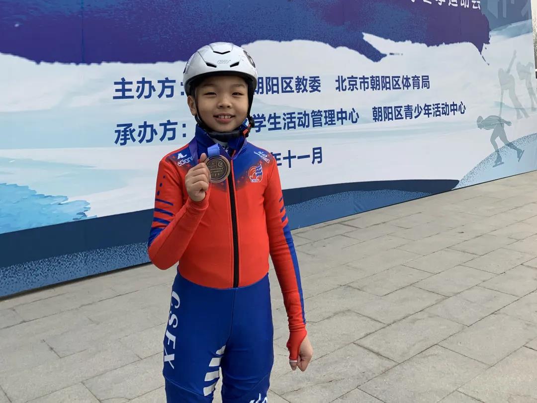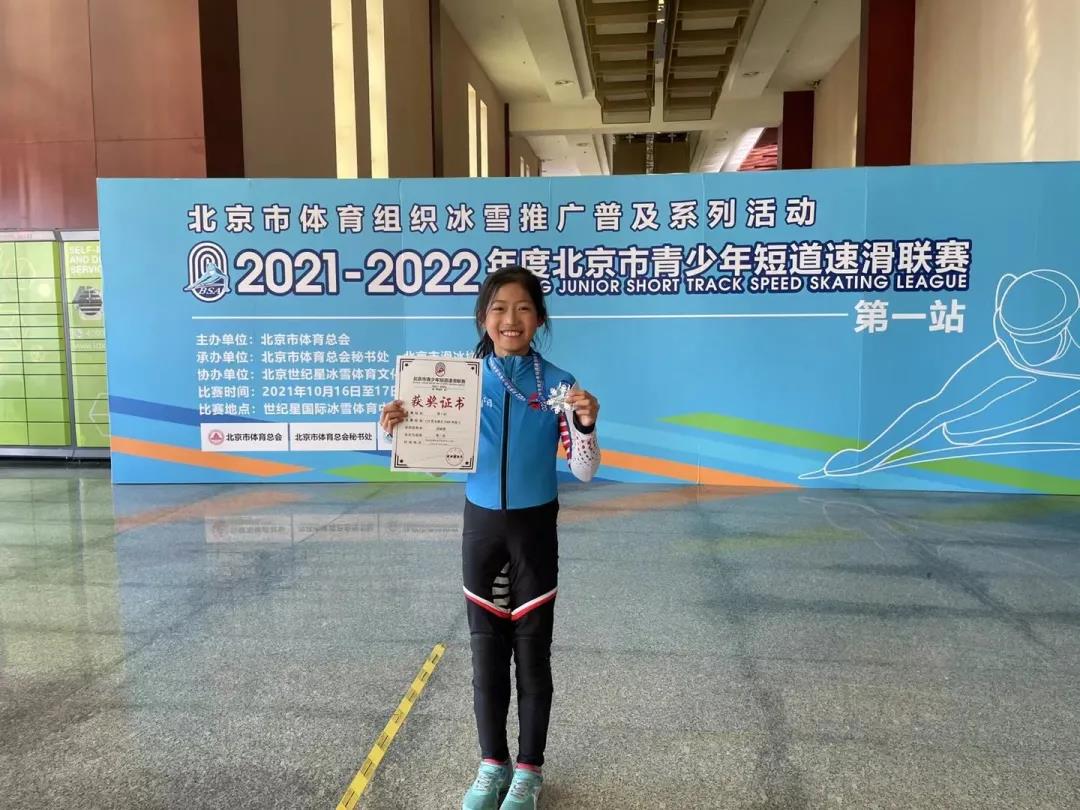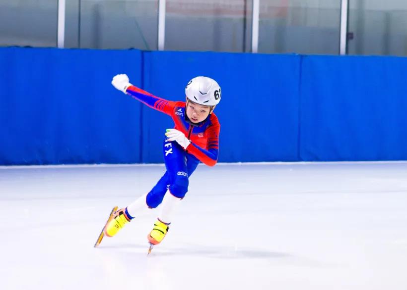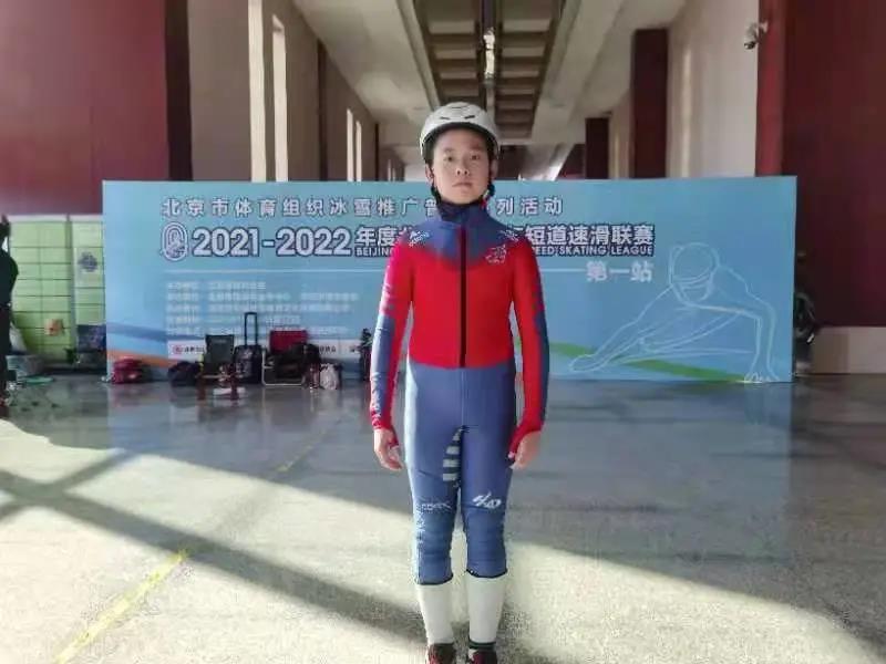 在三年级的时候,我通过学校滑冰社团开始接触短道速滑。一开始,我只是好奇和激动,到训练的时候,我遇到了很多困难,体能训练中常常偷偷抹眼泪,摔倒了想退出,每天喊苦喊累。可看到区队的大哥哥大姐姐在冰场上飒爽飞驰的身影,我又特别羡慕,自己也想跟他们一样穿上队服在冰场上体验速度与拼搏。我暗下决心,告诫并勉励自己:克服困难,咬牙坚持,我一定要成为正式队员!于是我积极参加日常训练、寒暑假训练和外地集训交流,终于,我成为了朝阳区队正式成员!现在我已经六年级了,参加过多次比赛,不仅训练了技术,增加了经验,还获得了成绩。我很感谢学校给我提供的平台,更谢谢教练老师们对我的栽培。