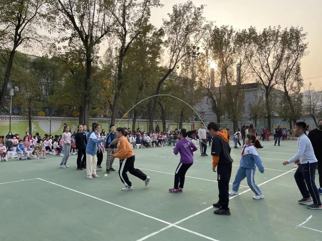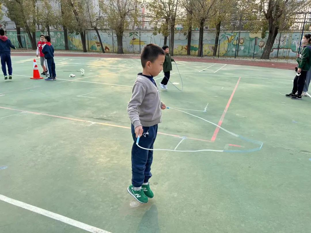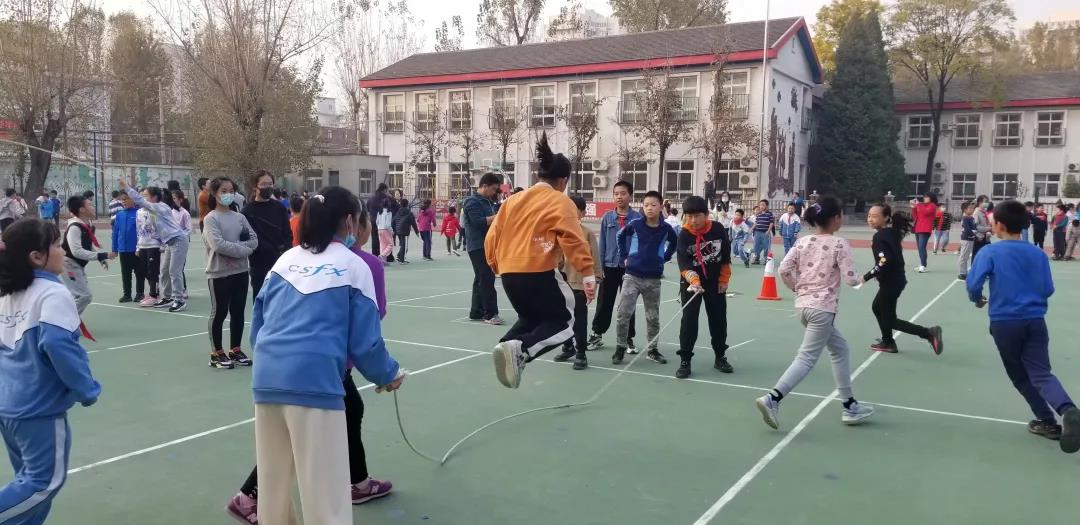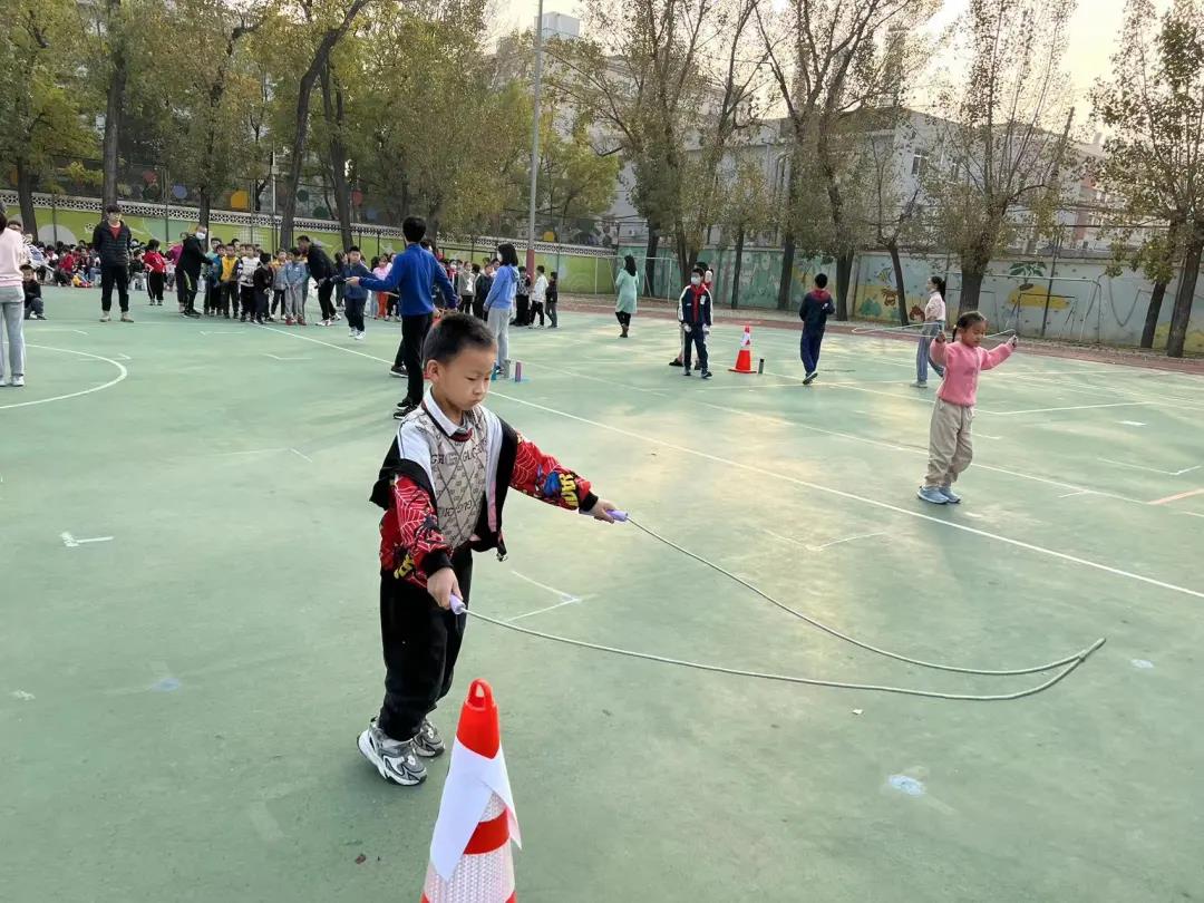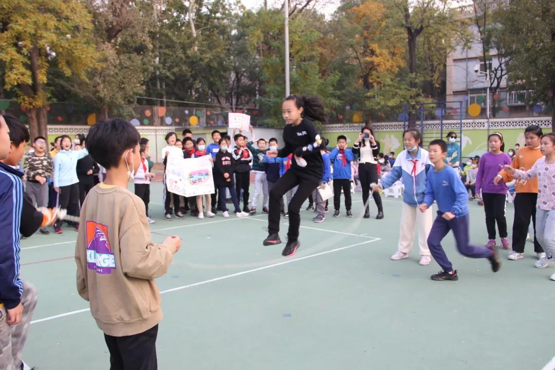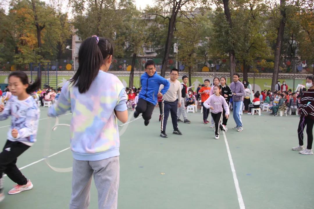 随着哨声响起,学校操场上一片欢腾景象,一条条小绳立刻舞起了风声,绳子在孩子们的脚底下“嗖嗖”地穿过,1-6年级的全体学生在班级团体单摇比赛中不断挑战自我,绽放光彩。