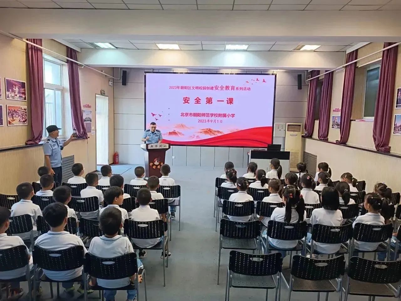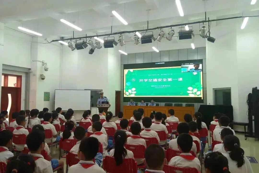 太阳宫派出所的民警和东外交通支队的警官为全校师生带来了以“强安全责任之基 筑文明行为之石”为主题的“开学安全第一课”。民警通过案例宣讲、问答等形式,从预防校园欺凌、预防电信诈骗、交通安全、“不购买、不乘坐、不使用违规电动三四轮车宣传”等开展教育,为小学生系好人生的安全扣。